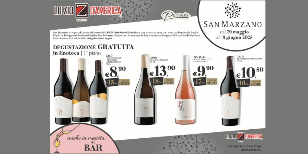 La collaborazione speciale tra Lo Zio d’America e Mandrarossa ti aspetta dal 20 al 29 Giugno con degustazione gratuita in enoteca e prezzi speciali in Enoteca e in mescita al Bar.