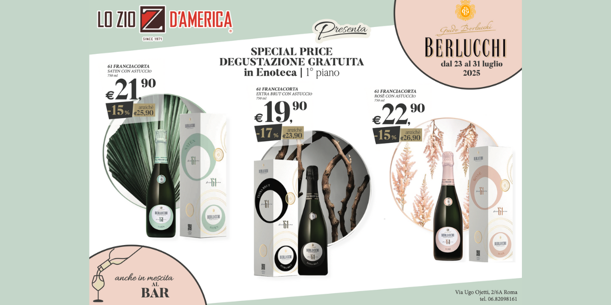 La collaborazione tra Lo Zio d’America e Berlucchi ti aspetta dal 23 al 31 Luglio. con una DEGUSTAZIONE GRATUITA in Enoteca (1° piano), con una selezione di bottiglie Franciacorta Berlucchi a prezzi speciali, disponibili anche in mescita al Bar de Lo Zio d’America.