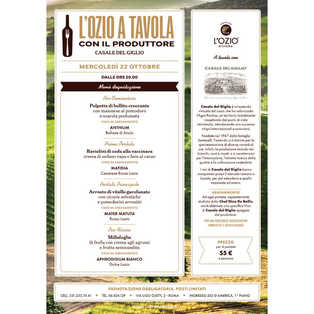Casale del Giglio, azienda vinicola del Lazio che ha valorizzato l’Agro Pontino, un territorio inizialmente inesplorato dal punto di vista vitivinicolo, introducendo con successo vitigni internazionali e autoctoni incontra i piatti creati dallo chef Dino De Bellis con prodotti della tradizione laziale.