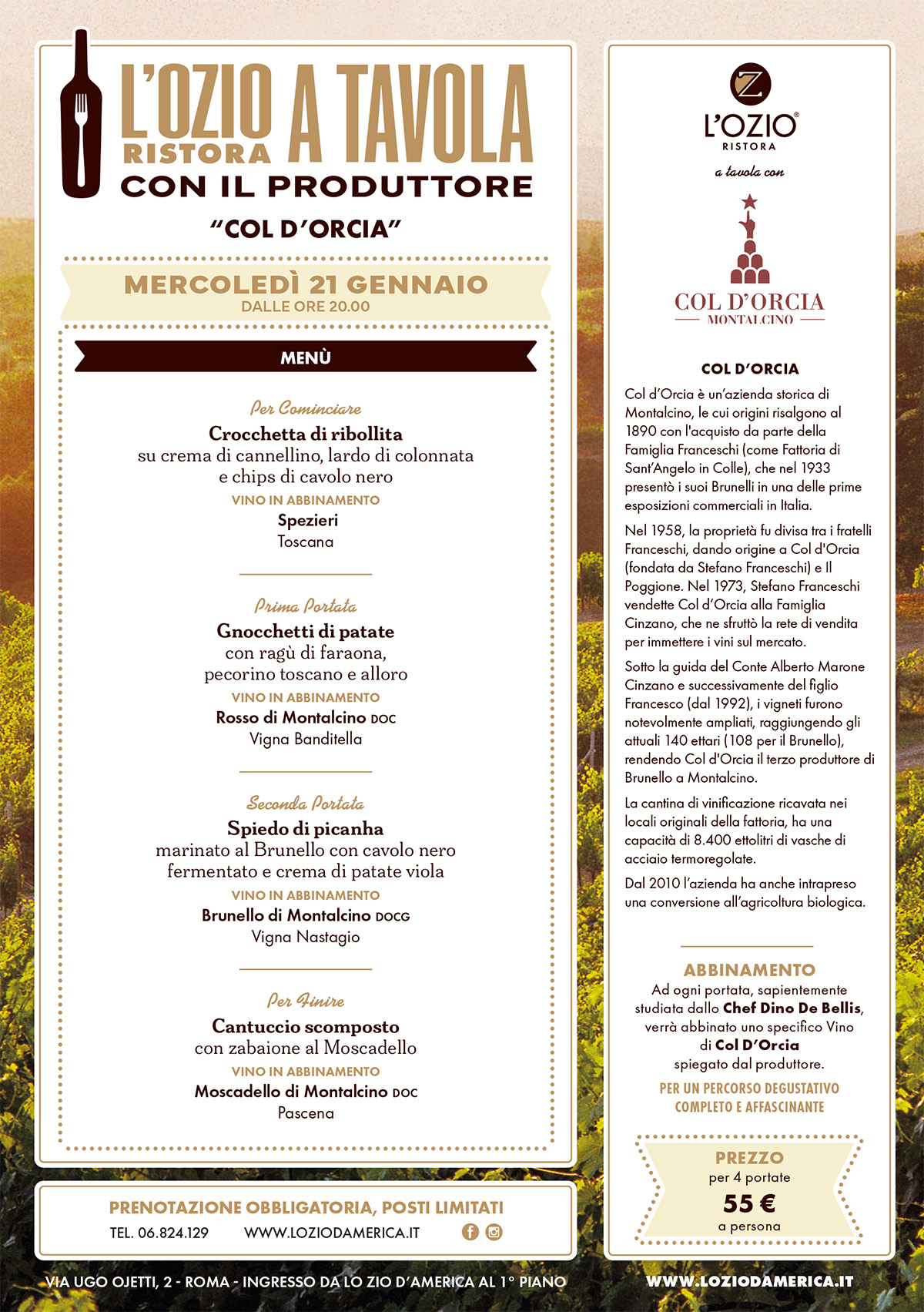 Dettagli sulla serata: Un percorso degustativo completo e affascinante. A ogni portata, sapientemente studiata dallo Chef de L’Ozio Ristora Dino De Bellis, verrà abbinato uno specifico vino di Col d’Orcia raccontato direttamente dal produttore.