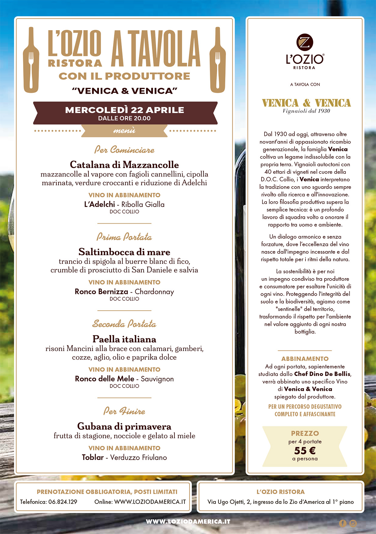 L’OZIO Ristora, il ristorante de Lo Zio d’America, presenta una cena evento in collaborazione con Venica & Venica.