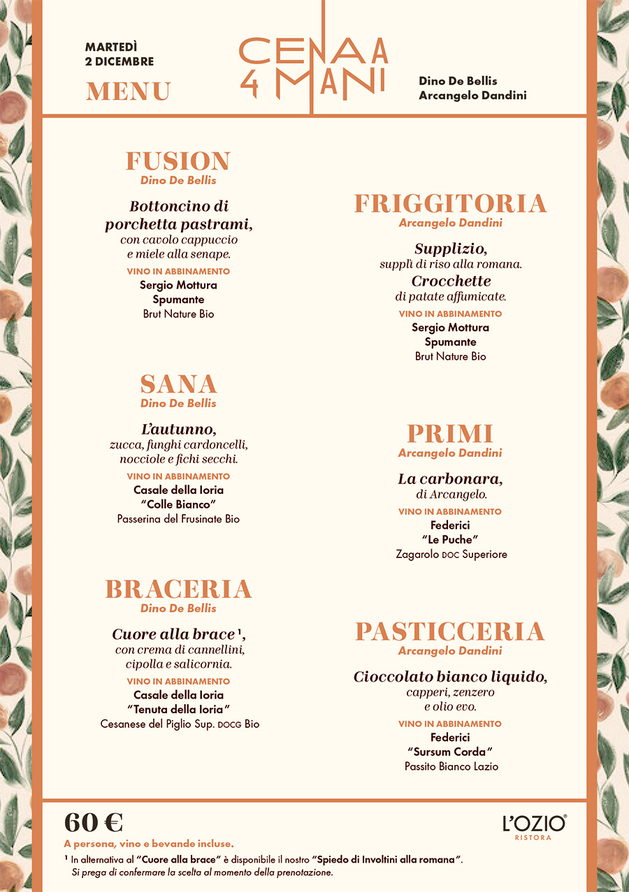 Gli Chef Dino De Bellis e Arcangelo Dandini martedì 2 dicembre propongono un Menu condiviso. NON MANCATE AL CONFRONTO A SUON DI PORTATE FRA DUE MAESTRI DELLA CUCINA ROMANA.