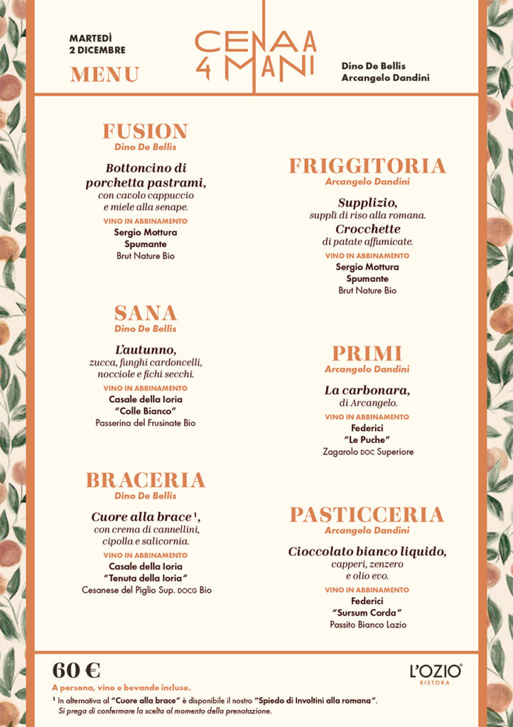 Gli Chef Dino De Bellis e Arcangelo Dandini martedì 2 dicembre propongono un Menu condiviso. NON MANCATE AL CONFRONTO A SUON DI PORTATE FRA DUE MAESTRI DELLA CUCINA ROMANA.   Marted' 2 Dicembre 2025   Dalle ore 20:00 La cena si svolge presso L'OZIO Ristora in Via Ugo Ojetti, 2, Roma   PRENOTAZIONE OBBLIGATORIA, POSTI LIMITATI Acquista online o prenota telefonando allo 06824129 La cena si svolge presso L'OZIO Ristora in Via Ugo Ojetti, 2, Roma